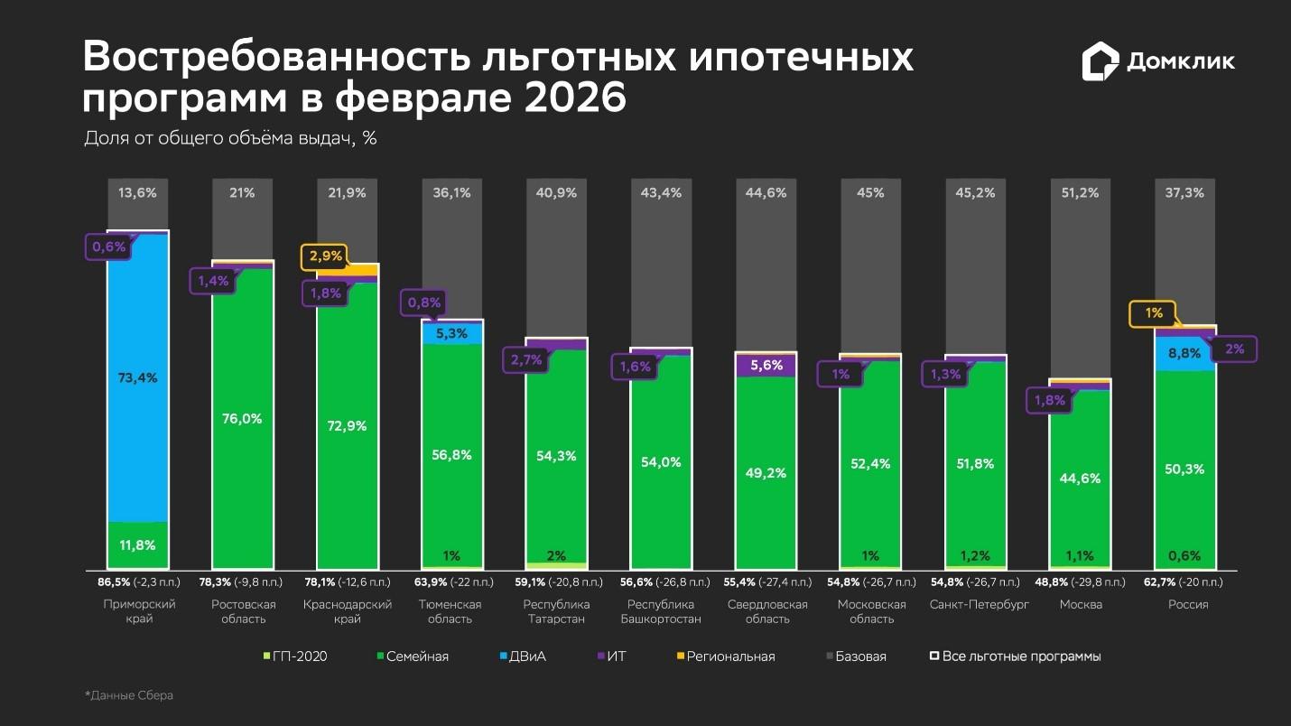 В Ростовской области по итогам февраля зафиксирована одна из самых высоких в стране доля льготной ипотеки. По данным аналитиков Домклик, регион занимает 3 место в России по доле «Семейной ипотеки» в общей структуре выдач — 76% от общего объема кредитования пришлось на эту программу (в Республике Адыгея — 90,3%, Астраханской области — 76,8%). Доля рыночной ипотеки в регионе составила 21%, еще 1,4% заняла ИТ-ипотека.