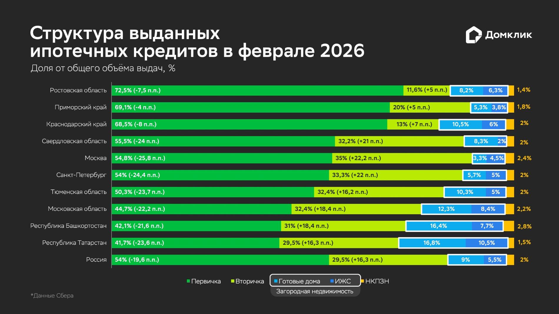 Так, по итогам февраля 2026 года Сбер выдал россиянам ипотечные кредиты на общую сумму 209,7 млрд рублей, что на 72,3% превышает показатели февраля 2025 года. Доля рыночной ипотеки по итогам месяца составила 37,3%, что на 20 п. п. выше январских значений. Рост востребованности базовых программ напрямую повлиял на структуру спроса по типам жилья: доля «вторички» достигла 29,5% (+16,3 п. п. к январю), обновив максимум с марта 2024 года.