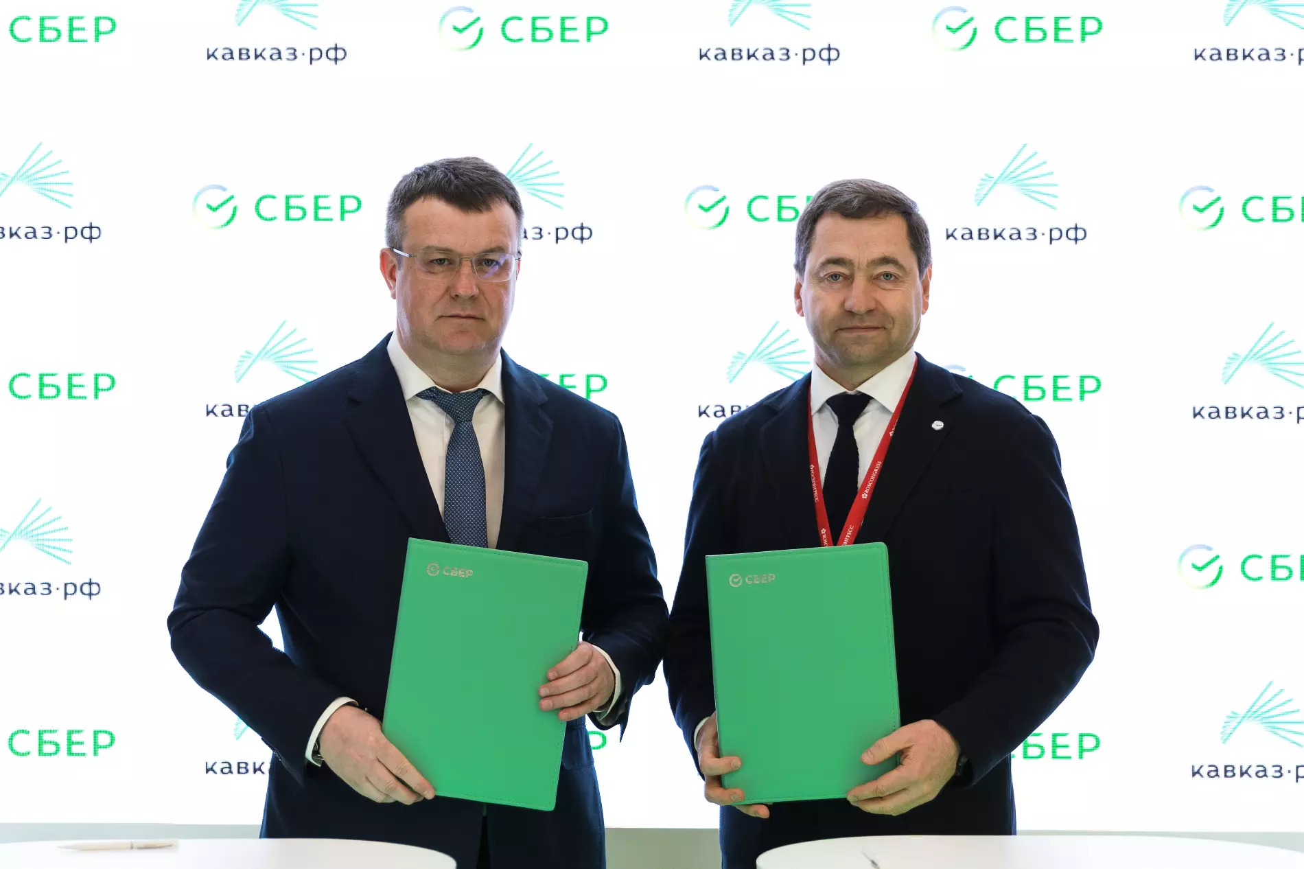 В рамках Кавказского инвестиционного форума Председатель Юго-Западного банка Сбербанка Анатолий Песенников и генеральный директор Кавказ.РФ Андрей Юмшанов подписали соглашение о намерениях по участию Сбера в реализации цифрового проекта Кавказ.РФ — «Инвестиционный хаб».